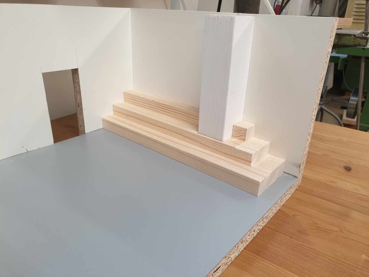 „Das war eine spannende Aufgabe, bei der wir alle Schritte vom Entwurf bis zur Umsetzung selbst durchgeführt haben“, erzählt Schreinermeister Martin Großmann, der das Team von aktuell acht Personen in der Schreinerei anleitet. „Wir haben von unserem Entwurf erstmal ein Modell gemacht. So bekommt man einen Eindruck, wie das Podest im Raum wirkt und kann alle Details genau abstimmen.“